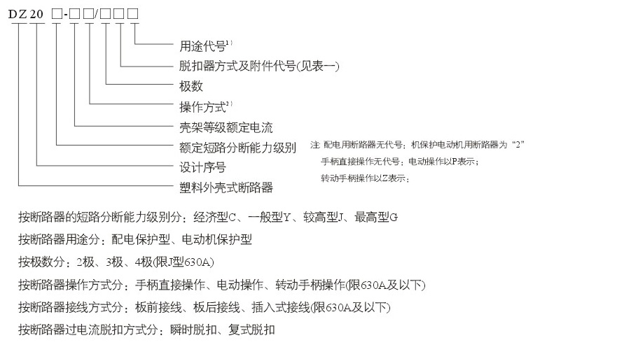 DZ2O系列塑料外殼式斷路器,適用于交流50Hz,額定電流從16A至2OOOA ,額定絕緣電壓660V ,額定工作電壓380V(400V)及以下的電路中作不頻繁的轉(zhuǎn)換和電動機(jī)不頻繁的起動之用。斷路器具有過載、短路和欠電壓保護(hù)裝置,能保護(hù)線路和電源設(shè)備不受損壞。
