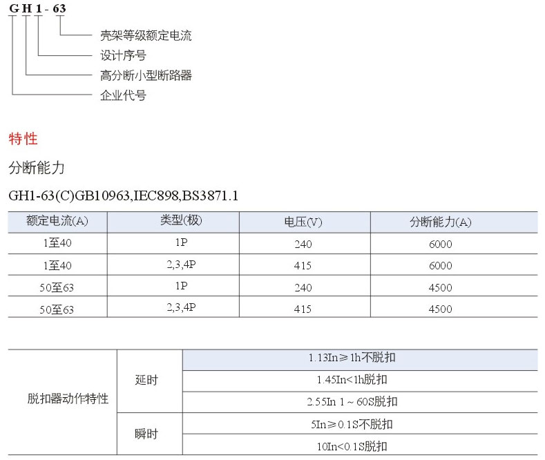 GHl高分斷小型斷路器具有結構先進、性能可靠、分斷能力高、外型美觀小巧等特點,殼體和三部件采用耐沖擊、高阻燃材料構成。適用于交流50出或60Hz、額定工作電壓為415V及以下,額定電流6A至63A的場所。主要用于辦公樓、住宅和類似的建筑物的照明、配電線路及設備的過載、短路保護,也可在正常情況下,作為線路不頻繁的轉換之用,該產品符合IEC60898和GB1 0963等標準要求。